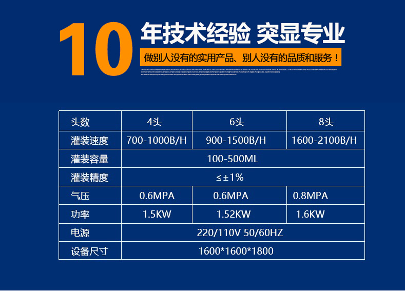 设备型号 | 灌装速度 | 灌装容量 | 灌装精度 | 气压 | 功率 | 电源 | 设备尺寸 |