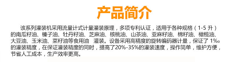 该系列灌装机采用流量计式计量灌装原理,多项认证,适用于各种规格(1-5升)的南瓜籽油、榛子油、牡丹籽油、芝麻油、核桃油、山茶油