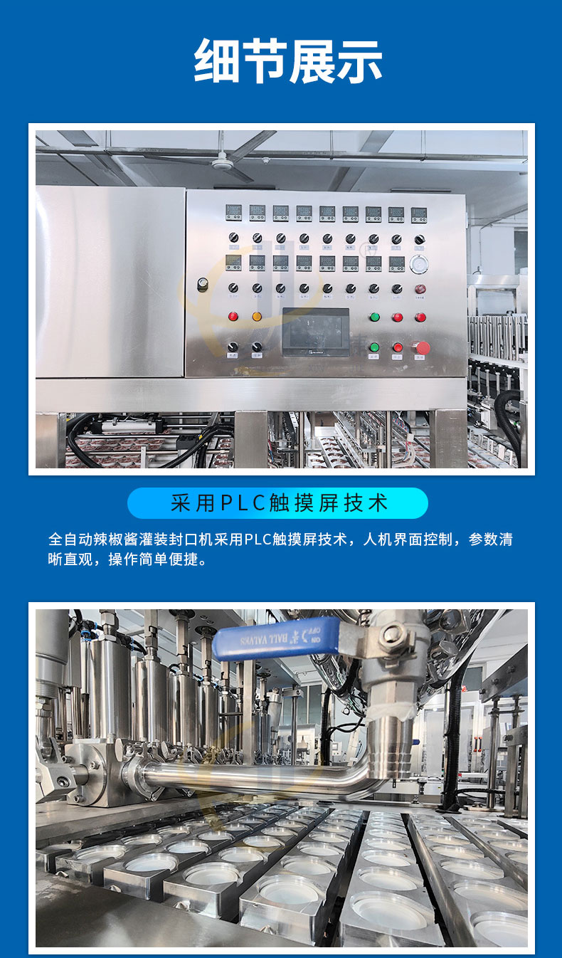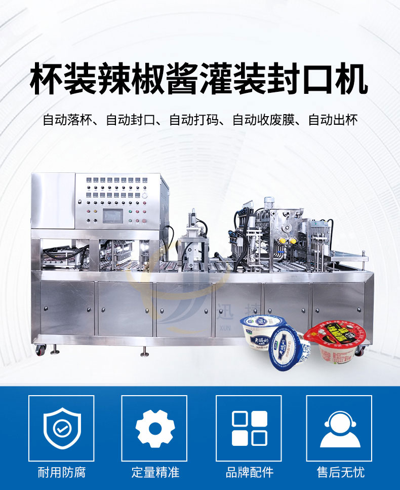 杯装辣椒酱灌装封口机适用于辣椒酱、黄豆酱、豆瓣酱、牛肉酱、沙拉酱等各种杯装、盒装等产品的生产。