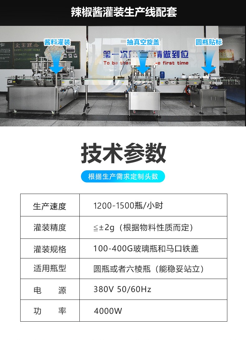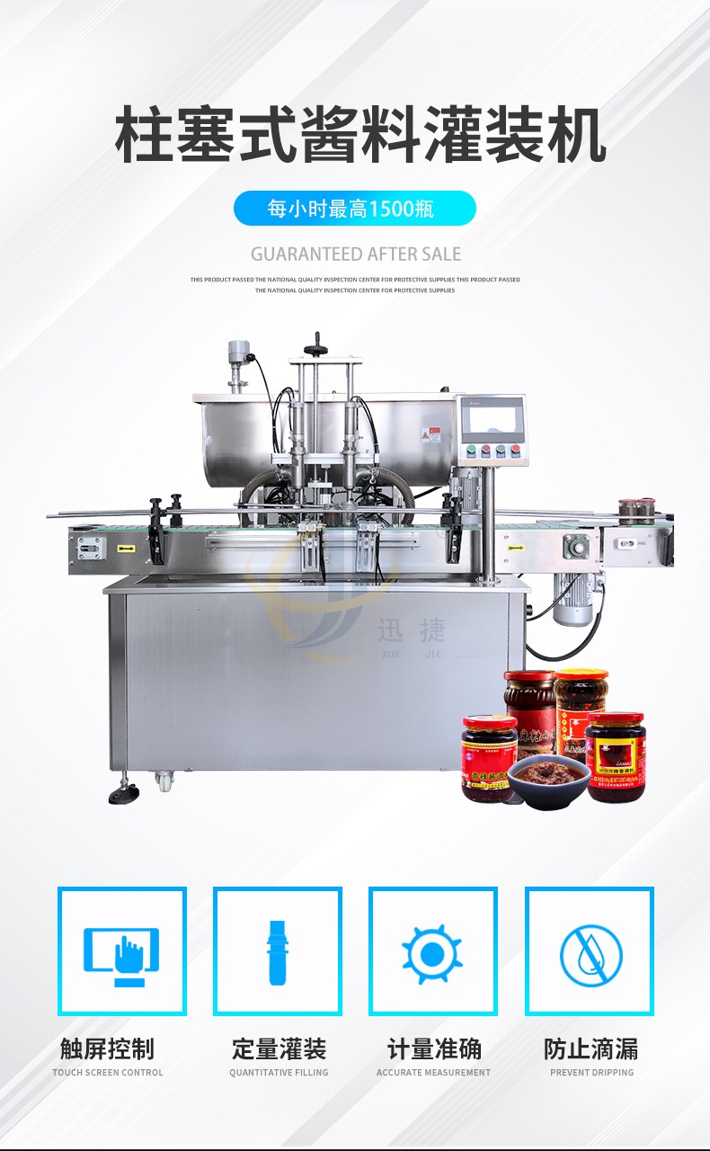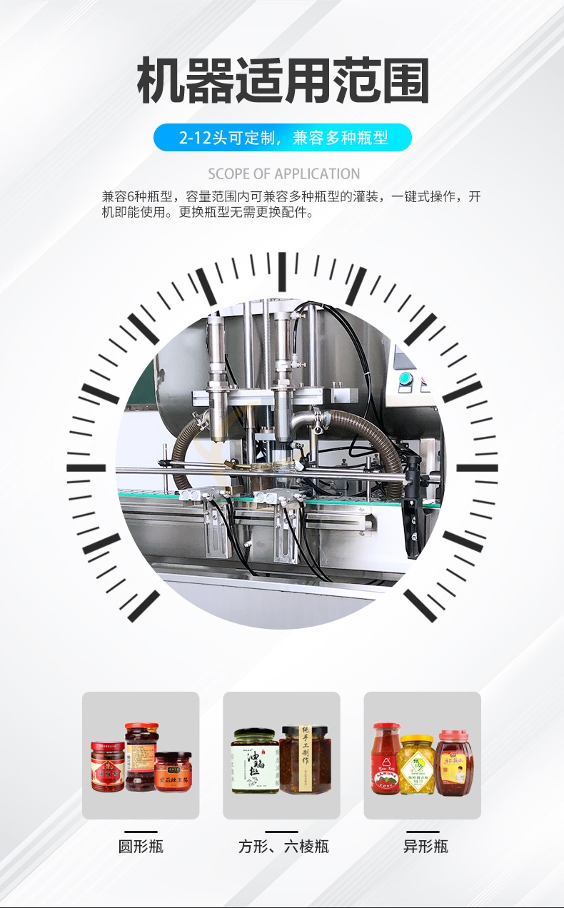 全自动双头酱料灌装机兼容6种瓶型,容量范围内可兼容多种瓶型的灌装,一键式操作,开机即能使用。更换瓶型无需更换配件。