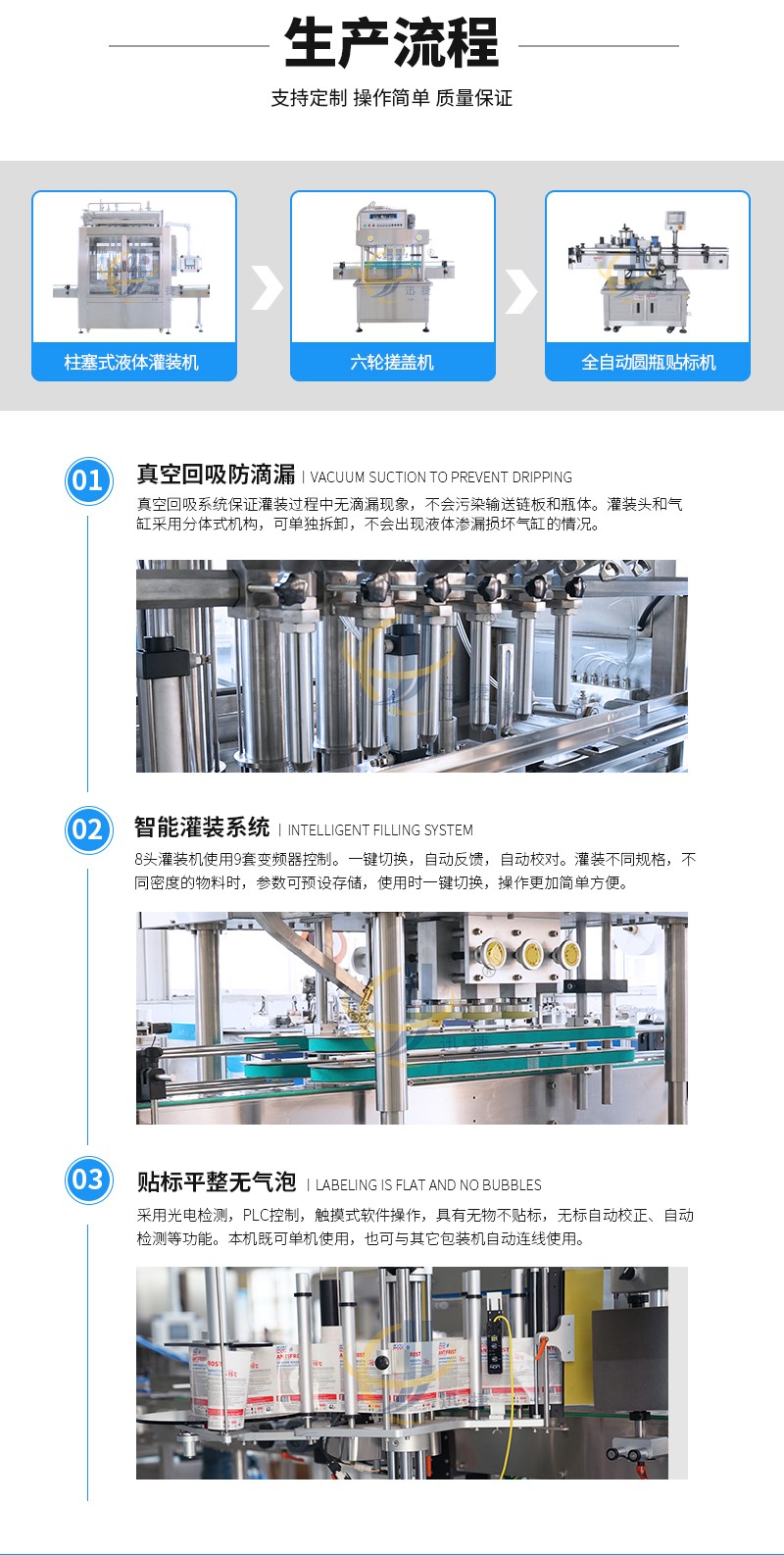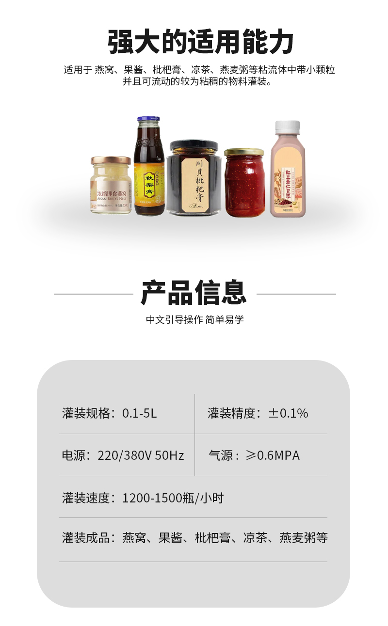 六头柱塞灌装生产线适用于燕窝、果酱、枇杷膏、凉茶、燕麦粥等粘流体中带小颗粒并且可流动的较为粘稠的物料灌装。