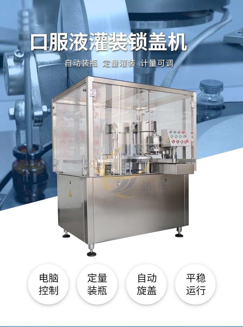 全自动口服液灌装锁盖机适用于多种规格的口服液糖浆瓶灌装轧盖。自动完成进瓶、理瓶、灌装、宋改、轧盖出瓶等多种工艺。