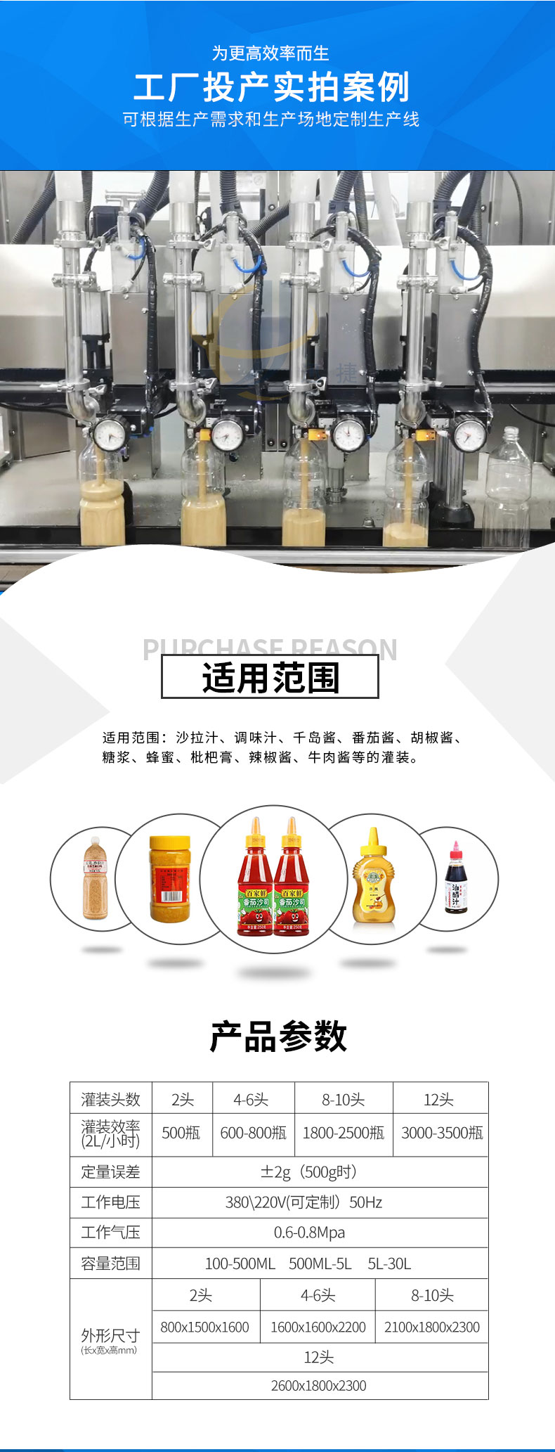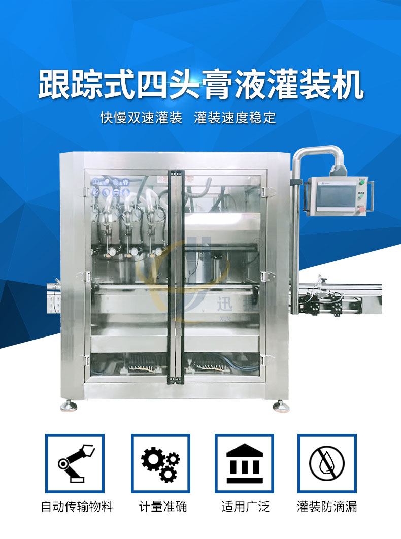 追踪式膏液灌装机适用范围:沙拉汁、调味汁、千岛酱、番茄酱、胡椒酱、糖浆、蜂蜜、枇杷膏、辣椒酱、牛肉酱等的灌装。