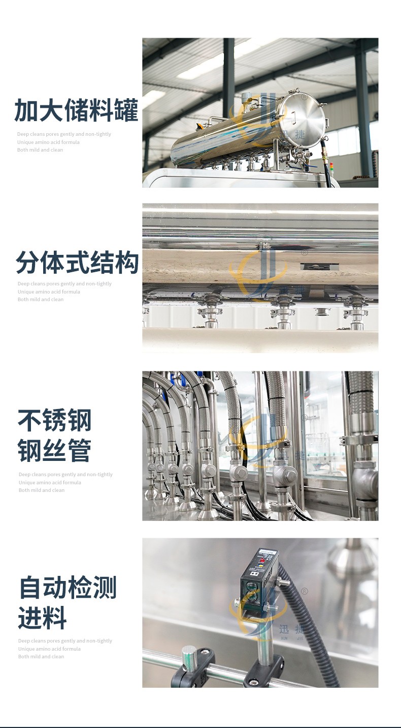 全自动液体灌装机用于灌装饮料、果汁,牛奶,酒精,消毒液,口服液,洗衣液等液体,广泛应用于食品,化工,医疗等行业,灌装精密,功能强,实用性高的灌装机械。