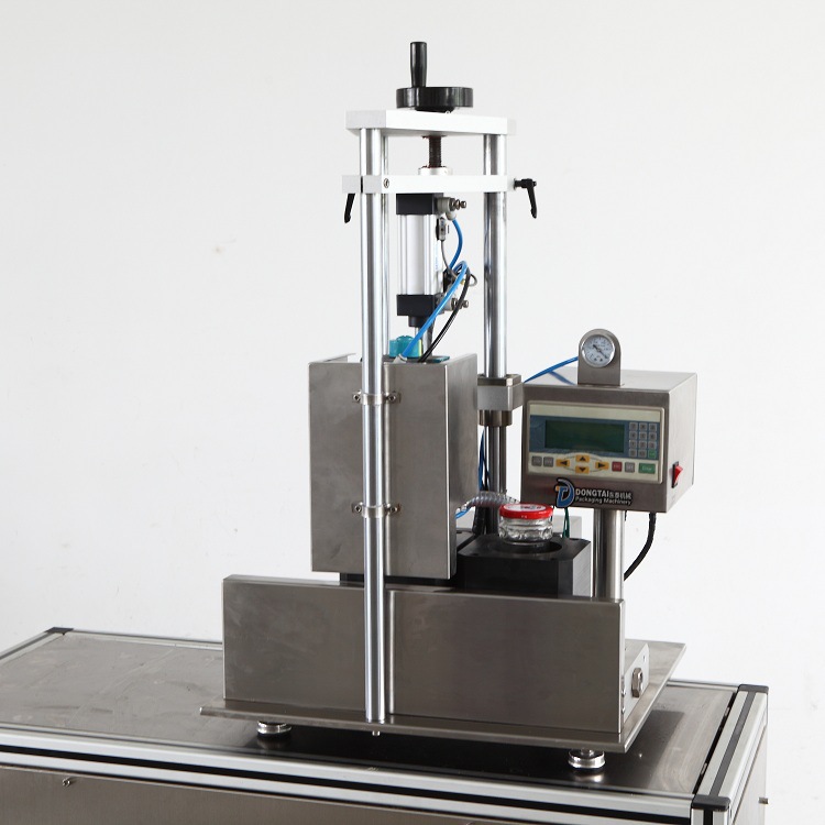 先从个词半自动来讲,半自动指的就是手动与机器相结合的操作流程:半自动玻璃瓶真空封口机是采用了人工上瓶,人工出瓶,机动旋盖与抽真空的方式来完成流程。由于人工上瓶,并且该半自动玻璃瓶真空旋盖机有无瓶不上盖,无瓶不抽真空的特点,所以大大减少了对瓶盖与瓶身的损害。并且人工与机器的配合丝毫不浪费时间,比纯手工的生产效率要几倍,还更节省人力,一台机器只需一个人便可轻松完成。