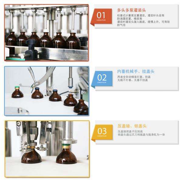 2. 稳定精准快速:柱塞式计量泵定量灌装,灌装针头设有防滴漏装置,精度高。每分钟可灌装40-60瓶。